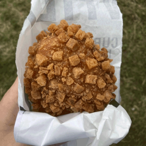 「小麦の奴隷」さんのカレーパンはサクサク食感でスパイスの香りが広がり、香りにそそられて購入した、ベーコン串も絶品。