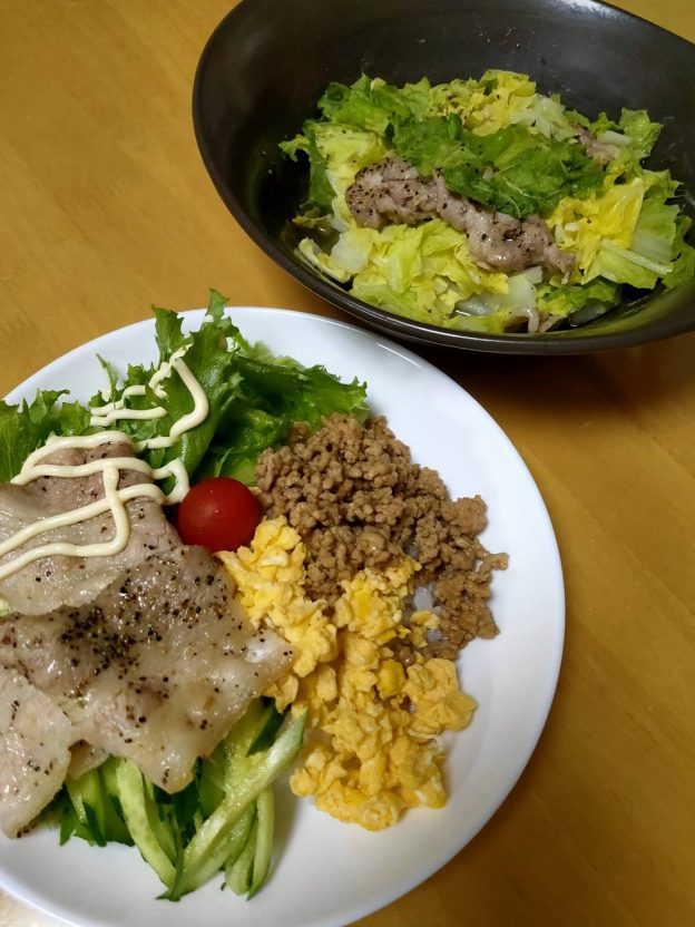 ごはんの上に、レタス・きゅうり・炒り卵・豚そぼろ、