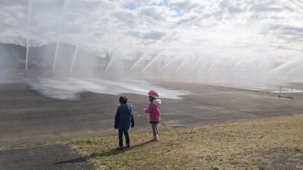 青空に向かって勢いよく放たれる放水は迫力があり、見ているだけで思わず見入ってしまいます。