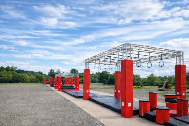 雲梯(うんてい)や高い壁、ジャンプやバランスを必要とする装置など、